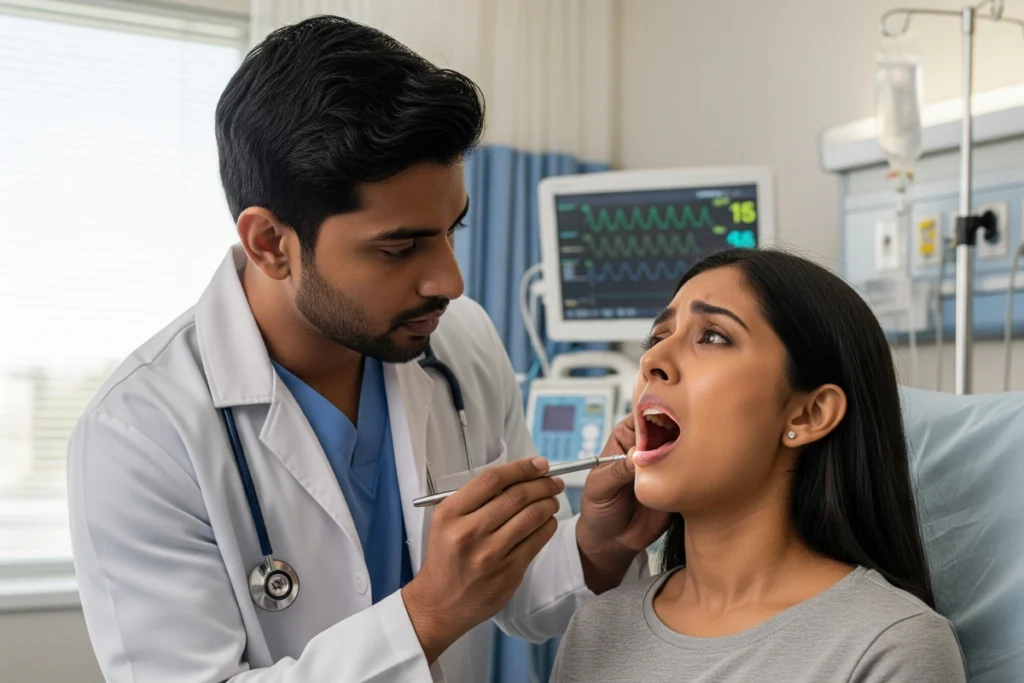 We understand that children often feel scared or anxious during throat exams. The doctor will explain what they are doing in simple, comforting terms. They might ask your child to "roar like a lion" to make the process fun and naturally open the airway wider. The doctor will also gently feel the sides of your child's neck to check for swollen, tender lymph nodes.